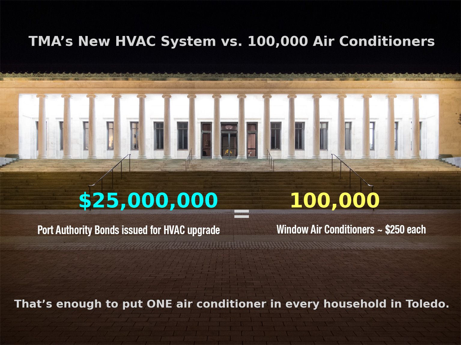 Toledo Museum of Art is spending enough money on their new HVAC system for every household in Toledo (about 100,000 households) to be able to throw out their old air conditioner and replace it with a brand a new one. That’s 100,000 new air conditioners!