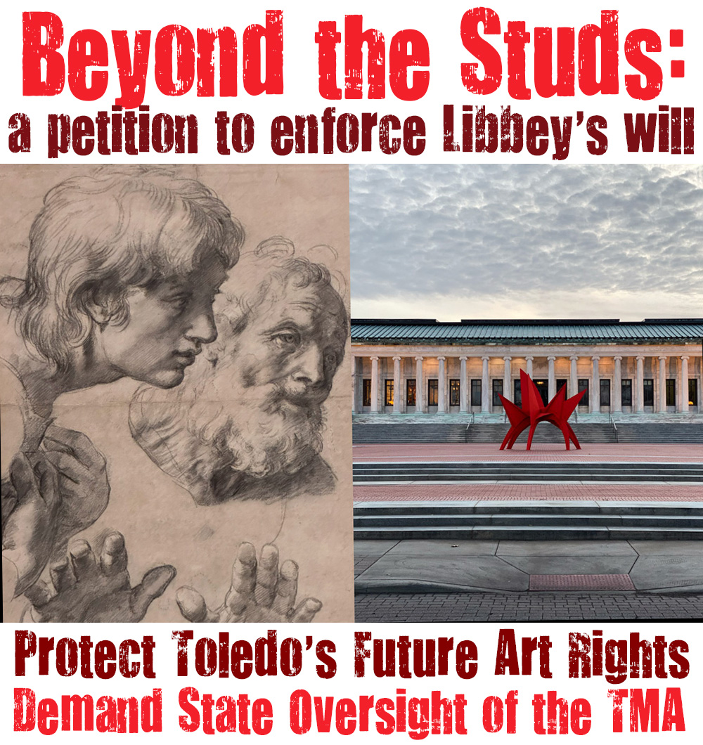 Should the current “stewards” of the Toledo Museum of Art be allowed to sell off the artwork of the museum and funnel the money into a completely different fund – a new fund without any of the restrictions that the Libbey Trust has – restrictions that helped make the Toledo Museum of Art become what it is today? Don’t the Libbey Endowment trustees have a fiduciary duty to look out after the best interests and the intentions of the Libbeys for the museum, as put forth in the Libbey wills? How could they let this happen?