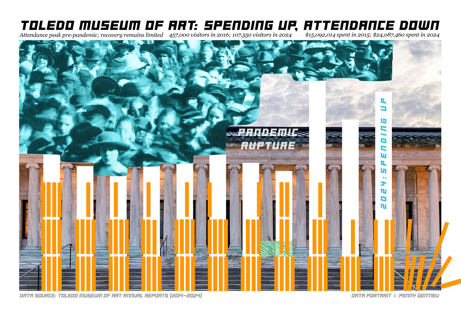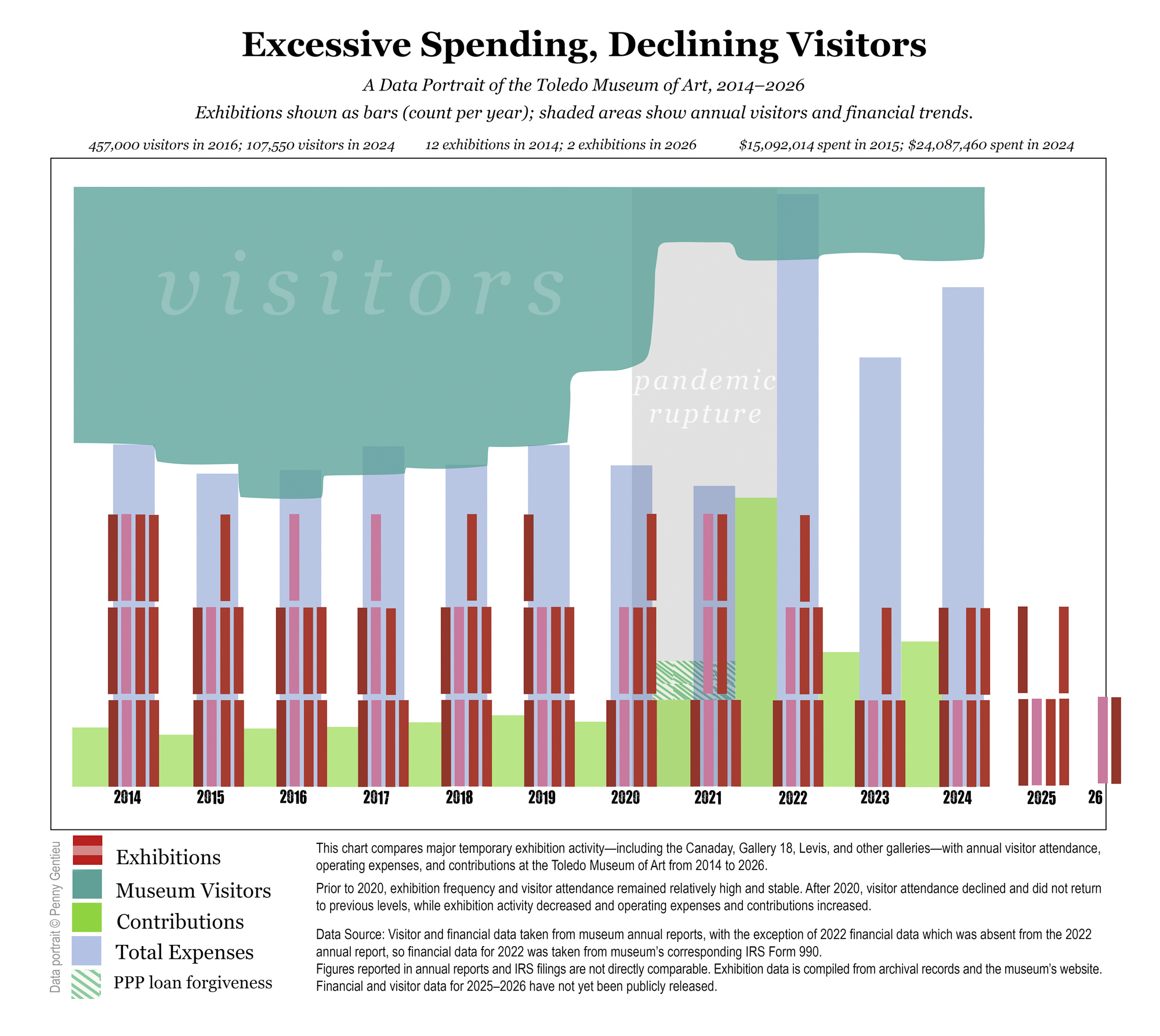 Data portraits tracking changes leading up to the museum’s current closure and reconfiguration, 2014–2026. These trends raise questions about alignment with the public mission established by Edward Drummond Libbey.