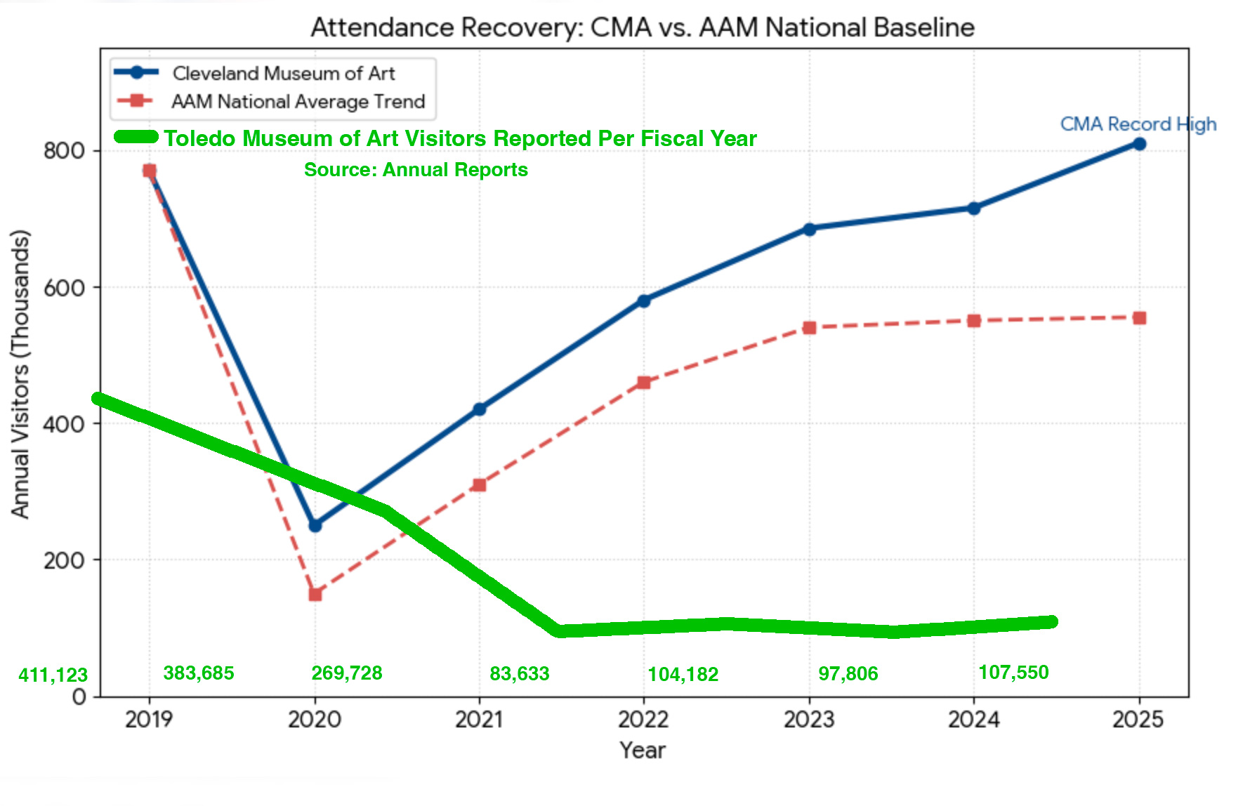 Failure to bring in visitors after the pandemic compared to the AAM national average trend and the attendance recovery of the Cleveland Museum of Art: